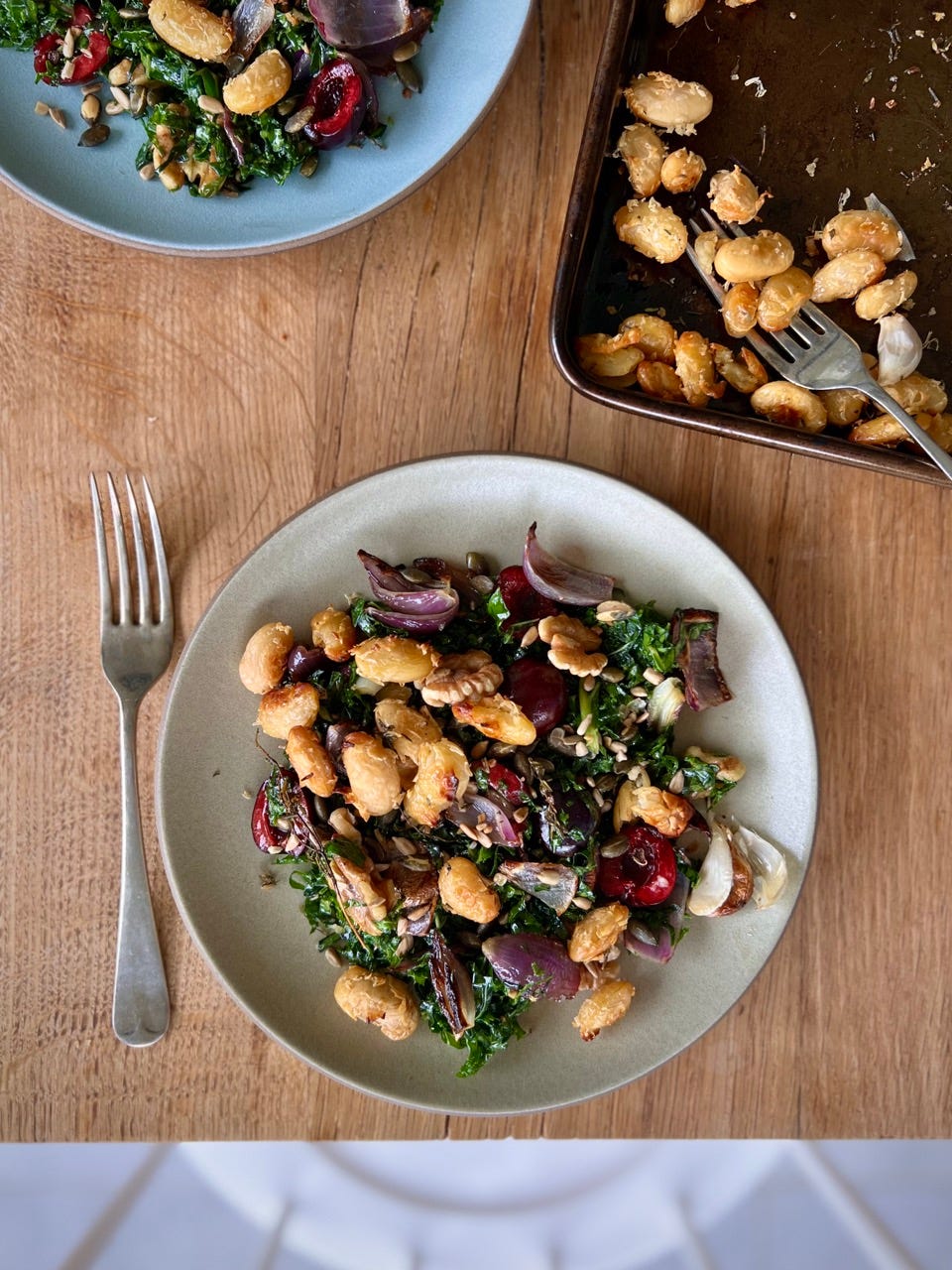 Kale & pickled cherry salad (with crispy butterbeans) for an unexpected early crop